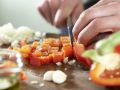 - 2Paprikaschoten vierteln, entkernen, waschen und würfeln. Zwiebeln schälen und fein würfeln, Knoblauch schälen und fein hacken.